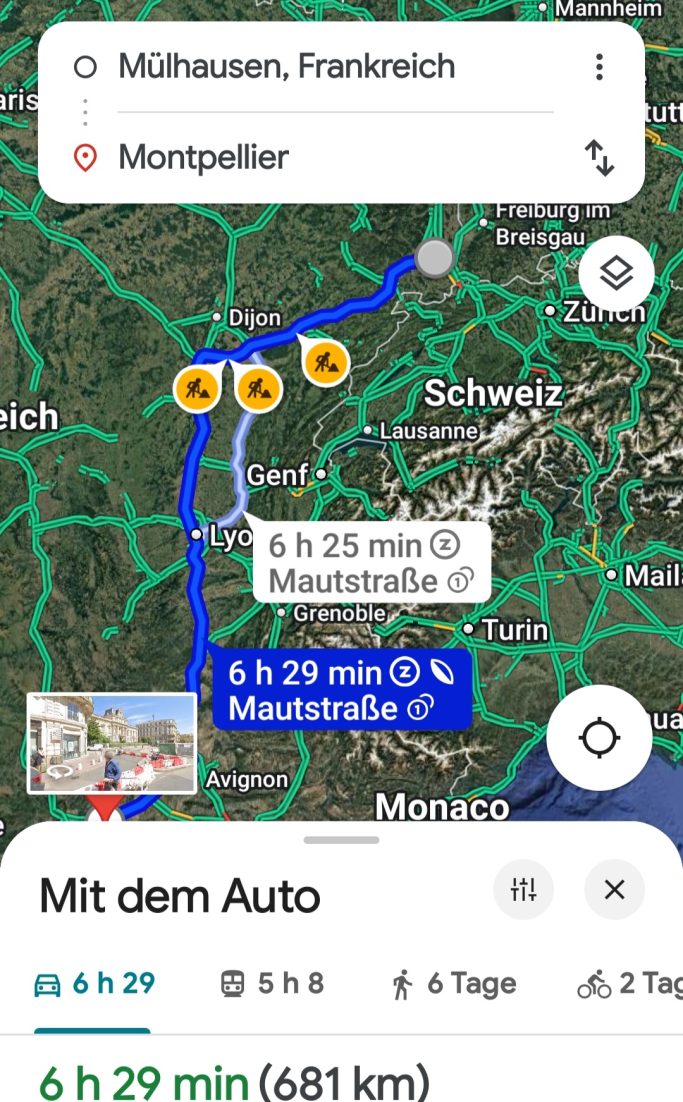Danach haben wir auf dem Balkon bei milden Temperaturen und hupenden Autos noch den morgigen Tag geplant. Die nächste Übernachtung soll in Montpellier am Mittelmeer stattfinden. Dort buchen wir noch am selben Abend ein kleines Appartement. In knapp 7 Stunden sollen die 690 km zu schaffen sein. Wir planen wieder 8 - 9 Stunden.