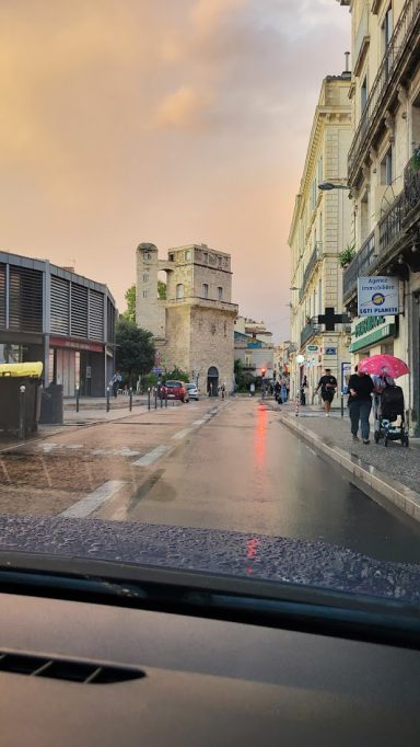 Um 18:00 kommen wir in Montpellier an. Zum ersten Mal war das Mittelmeer zu sehen!! Laura, unsere Vermieterin, hat uns eine tolle Anleitung für die Anreise und die kontaktlose Schlüsselübergabe geschickt. Das hat alles super geklappt! Wir haben grad den Schlüssel aus der Box gefischt und sind im Treppenhaus, da fängt es an zu regnen, wie aus Eimern.