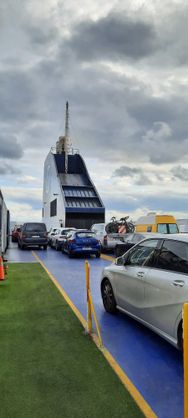 Dann rein ins Schiff , rauf aufs Parkdeck, Parken auf dem gleichen Platz, wie vor 10 Tagen ( Michel hat das so organisiert, sagt er. Er mag nicht so gern Veränderungen... und er mag die Nähe zu uns.
