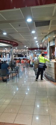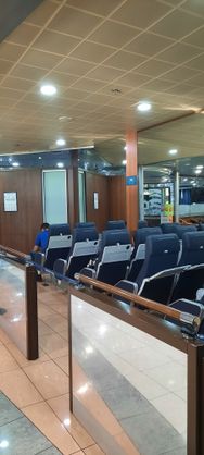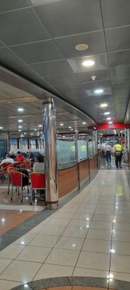 Auf dem Schiff versuche ich, meine Kopfschmerzen loszuwerden und rolle mich auf den Schlafsesseln ein. Ein bisschen Schlaf finde ich tatsächlich. Köppi-Aua werden allmählich etwas erträglich. Wir gehen im Schiffsrestaurant essen. Ich bin ja nun wirklich überhaupt nicht pingelig... und ein Allesfresser, wenn ich Hunger hab... aber das hier geht überhaupt nicht! Schlecht und teuer! Bringt euch lieber ein paar Snacks mit! Den Rest der Überfahrt pendel ich zwischen Schlafsessel und Deck. Opa ist auf dem Deck angewachsen.
