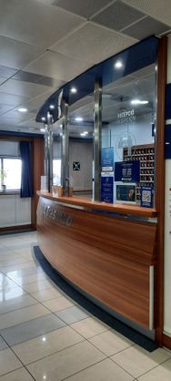 Hat so mittel geklappt. Kurz vor dem Hafen haben wir uns dann auf der Stadtautobahn doch verfahren. 2 x sind wir im Kreis gefahren... aber dann... dann haben wir unser Schiff gefunden! Haben uns dann von sehr netten, aber hektischen Spaniern ( welche Sprache die Jungs wirklich gesprochen haben, kann ich nicht sagen... ) einweisen lassen, standen dann in Reihe 16 und dachten, alles sei damit getan. So ungefähr nach 40 Minuten, kam es uns im wahrsten Sinne des Wortes spanisch vor, dass die Fahrer der anderen Fahrzeuge alle kurz weggingen und mit einem dekorativen "Palma-Schild" für die Windschutzscheibe zurück kamen. OK- Ich muss eh aufs Klo, also bin ich auch mal los, um die Lage zu peilen. Irgendwann - nach einigen Dialogen mit fremdsprachigen, nicht soooo freundlichen Menschen, habe ich dann begriffen, dass ich aussen ums ganze Gelände laufen muss - zum Counter - und dort unsere Bordcards abholen muss. Supi... ich muss jetzt echt aufs Klo!! Also schnellen Schrittes zum Trasmed-Gebäude und die Unterlagen abgeholt. Vorher zum Klo.