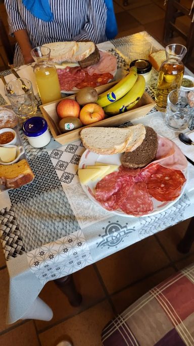Nächster Morgen... So ein bezauberndes, kleines Zimmer... und so schlecht geschlafen. Wieder heftige Kopfschmerzen, Husten und Halsschmerzen. Im Halbschlaf habe ich überlegt, was zu tun ist... Evtl. noch eine Nacht im Can Felipe dranhängen? Aber reicht das? Morgens habe ich mich dann doch hochgequält und als ich den liebevoll gedeckten Frühstückstisch gesehen habe, ging es mir gleich viel besser!! Wir frühstücken ganz gemütlich und ohne Zeitdruck. Pfelfe packt sich noch 2 Stück Kuchen für die Fahrt ein und wir brechen gegen 10:30 Richtung Lyon auf.